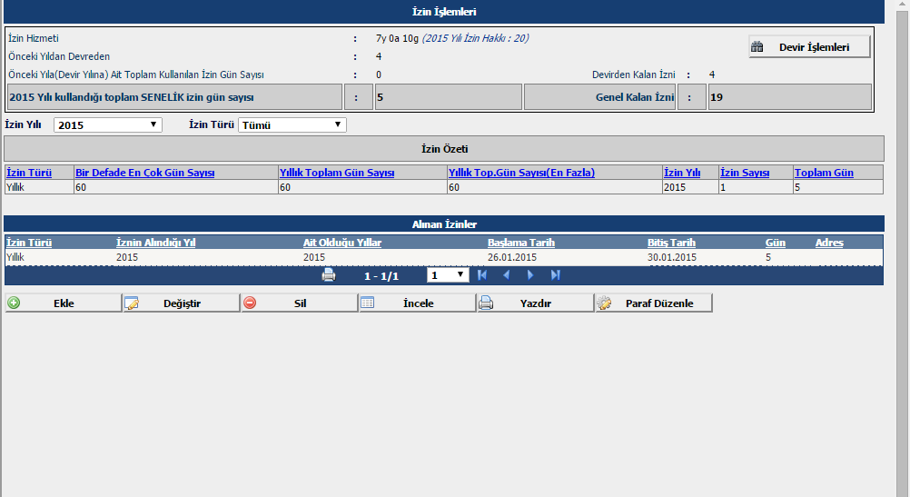 İzin bilgileri eklenmeden önce Devir İşlemleri alanına geçen yıldan devreden izin gün sayısı doğru şekilde yazılmalıdır.