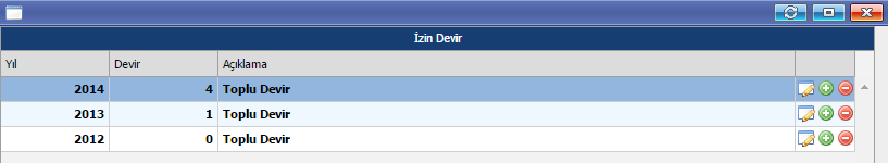 İlk aşamada birimdeki tüm personelin izni girilmelidir. İlgili personelin bütün izinleri girildikten sonra Genel Kalan İzin alanında izni doğru değilse Devir İşlemleri alanında 2014 yılından kaç gün izin devretmesi gerekiyorsa kalem işaretli alana tıklanarak manuel olarak girilebilir.