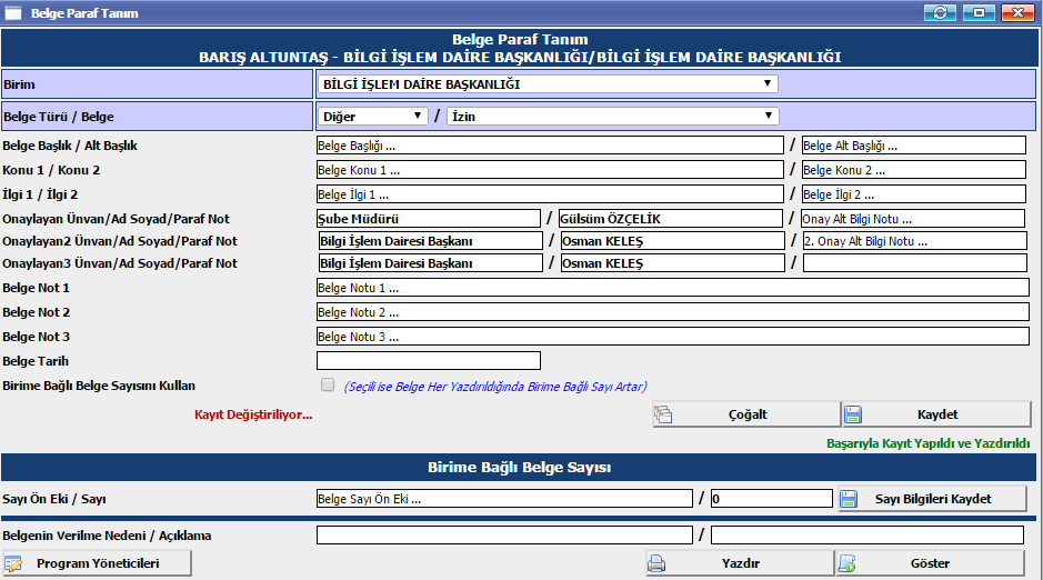 Paraf Düzenle alanı Onaylayan Unvan/Ad Soyad alanına Paraf/İmza atacak personelin unvanı ve ismi örnekteki gibi girilir.