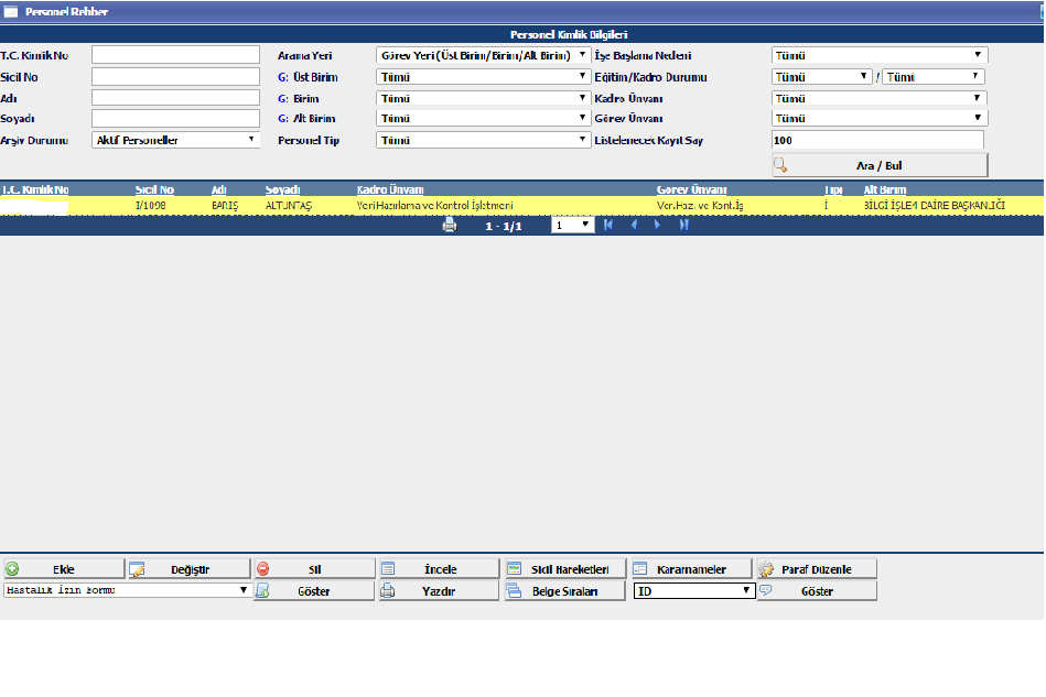 İzin Bilgileri: Personel Rehber alanından personel Ara/Bul ile bulunur. Değiştir alanına tıklanarak açılır. Kişi kartı açıldıktan sonra ikinci sırada yer alan Personel İşlemleri-İzin İşlemleri alanından İzin ve rapor bilgileri girilir.
