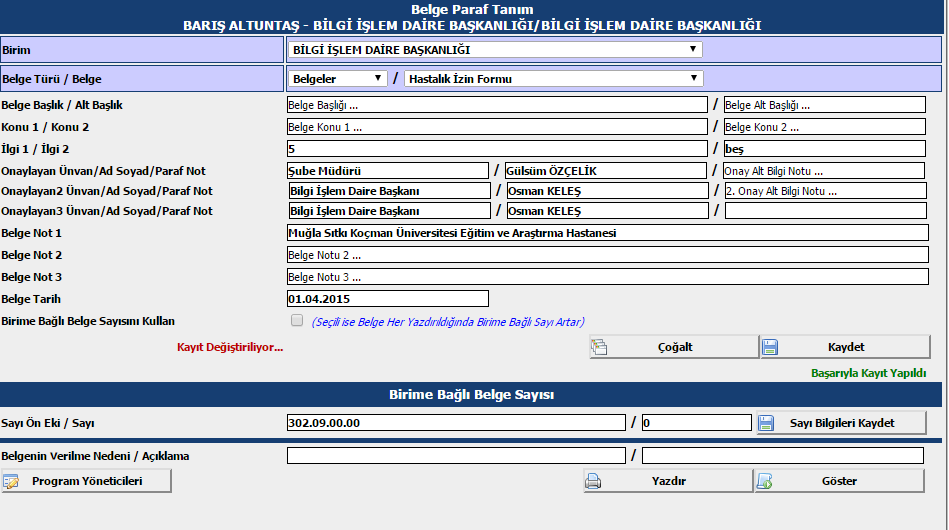 Paraf Düzenle-Belge Türü/Belgeler alanında Belgeler- Hastalık İzin Formu seçilir. Onaylayan Unvan/Ad Soyad alanına Paraf/İmza atacak personelin unvanı ve ismi örnekteki gibi girilir.